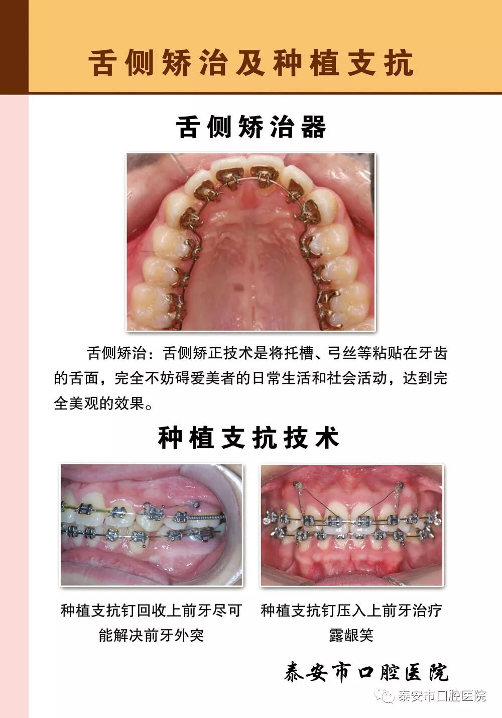 随着科学技术和生活水平的不断提高,人们的口腔健康需求不断增加。不过,许多家长对于儿童牙齿矫正仍存在观念误区,口腔正畸专家建议家长带孩子定期到专业口腔医院做口腔检查,发现问题早期矫治。今天,我们谈谈关于“儿童口腔正畸”的几个误区。 误区1 牙齿没换完不能做矫正 关于矫治的最佳年龄,需根据孩子牙齿的错类型而定,一般分为三个阶段:乳牙期阶段(4-5岁)主要适于纠正乳牙反(俗称“地包天”),不良习惯(如吐舌、咬唇、伸下巴等),预防错的发生。替牙期阶段(女孩9-11岁,男孩10-12岁)适用于由于不良习惯、舌干扰等因素引起的功能性错和早期骨性错(如下颌后缩、地包天等),以期利用儿童生长潜力,得到改善甚至较大程度的逆转。恒牙期阶段(女孩11-14岁,男孩13-15岁),常见的错畸形在这个阶段可以得到很好的治疗,个别严重的骨性错畸形应在18岁后正畸-正颌联合治疗。因此,牙齿是否需要矫治,应咨询专业正畸医师,何时进行矫治,因人而异。 误区2 矫正会影响孩子的生长发育 只要注意均衡饮食,牙齿矫正不会直接影响儿童的生长发育。矫齿矫正对饮食没有绝对的禁忌,家长可以了解正畸期间饮食注意事项,避免对孩子的生长发育造成影响。 误区3 矫正只能解决牙齿的问题 牙齿矫正不单单解决牙齿的问题,针对某些情况,会在一定程度上对容貌有很大改善作用。正畸治疗可以改变牙齿的位置,继而带动唇、颏形态的变化,因此许多病例通过正畸治疗可以在很大程度上改善侧貌以及正面微笑美学。 误区4 拔牙矫正会留下牙缝 规范的正畸治疗会让牙齿重新紧密排列,不会留有牙缝。正畸治疗可以让牙齿由原有的位置移动到新的位置,而拔牙矫正是给牙列拥挤的患者提供充分的空间以排齐牙列,或利用拔牙间隙内收前突的牙齿来获得较好的面型。 误区5 矫治力越大,疗效就越快 很小的正畸力即可启动牙齿移动,正畸力过大反而会带来很多副作用。牙齿移动是成骨细胞和破骨细胞参与改建的生理性移动,不同于单纯的物理移动,所以并非力量越大移动速度越快。 误区6 矫治后牙齿松动、早脱落 牙齿矫正是通过轻的矫治力诱导牙齿移动,是一种缓慢的生物改建过程,被移动牙齿的一侧骨吸收,另一侧骨改建,最终使牙齿移动至正常位置。矫治过程是渐进的,牙齿也是稳定的,专业医生对牙齿施加的力量完全符合生物学原则,不会对牙齿、牙周组织产生损伤。 误区7 拆除牙套矫治就结束了 摘掉牙套后并不意味着矫治结束,还需要戴用保持器维持牙齿现在的位置。因为刚取下牙套时,牙齿、颌骨、肌肉之间尚未达到一个稳定的平衡点,不戴保持器很有可能会反弹。因此,应遵医嘱坚持佩戴保持器。 专业口腔正畸专家建议:广大正畸患者选择正规医疗机构,由获得正畸专科资质的正畸医生来帮助儿童保护和矫正牙齿! 专业正畸研究生团队 专 业 值 得 信 赖 正畸科开展牙齿矫治已有三十多年的历史,现在发展成为一支拥有16名专业研究生正畸团队,年接诊患者近两千人次,是全市独立成科早,规模大,技术全,口腔专业技术力量达到国内先进水平的口腔专业特色科室。主要开展口腔错畸形(牙齿排列不齐)的防治,开展活动矫治、功能矫治、固定矫治、舌侧矫治、隐形无托槽矫治等技术,开展种植体支抗、夜磨牙、呼吸睡眠暂停综合征的辅助治疗以及正畸—正颌联合矫治等。医院配备先进的口腔CBCT、颌骨全景、头颅测量三合一设备,为三维精准诊疗提供保障。精湛的医疗技术配合国际先进的口腔诊疗设备,使医院的口腔专业诊疗水平达到国内先进水平。 正畸科咨询电话:8251563 8251973