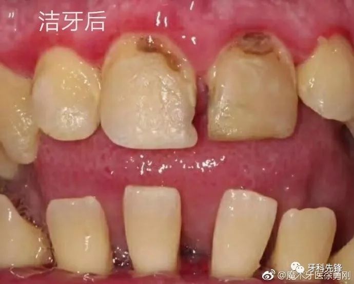 之前 @魔术牙医徐勇刚 在微博上发了一组从来没洗过牙的患者洁牙前后对比图,大家感受一下