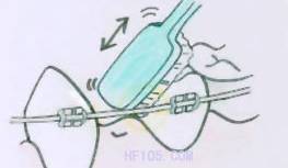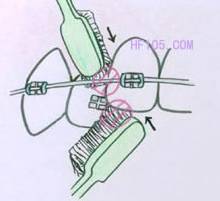 刷上牙的时候,将牙刷刷毛45度斜向下,放到托槽的上方和牙龈之间的部分,横向轻轻反复颤动,不要动作太大,每次刷3个牙左右的距离为宜,动作要轻柔,不要用刷毛太硬的牙刷,以免戳伤牙龈。刷下牙的时候则相反,刷毛45度向上,放在托槽的下方和牙龈之间的部分。