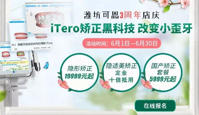 2019年高考结束了 学子们即将进入崭新的大学生活 在这个“颜值当道”的社会里 美也是一种优势 而牙齿不齐、地包天、深覆合等牙齿问题 严重拉低了颜值 想笑?爱美?想要高颜值? 抓住暑期矫牙黄金期这个重要时刻 利用假期实现逆袭 颜值暴涨变男神/女神 每年高考后的假期,都是高中毕业生牙齿矫正的高峰,很多家长陪孩子前来看牙,希望通过牙齿矫正改善牙齿不齐等牙齿问题。 云数字化矫正诊疗仪,5分钟预知最美的你。根据患者牙齿情况由计算机设计完成,跟牙齿形态比较接近,使上颚或下颚的牙齿依照预定的设计移动,让牙齿悄悄变整齐。还有优惠等你来申领! ①隐形牙齿矫正19999元起 ②美国隐适美隐形矫正定金十倍抵用 ③国产矫正套餐5999元起 报名免口腔基础检查费、正畸设计费 长按二维码 报名申请 识别二维码 评估矫正费用 地址: 潍坊市奎文区胜利东街4759号(新华书店东临) 点击下方“阅读原文”即可预约就诊
