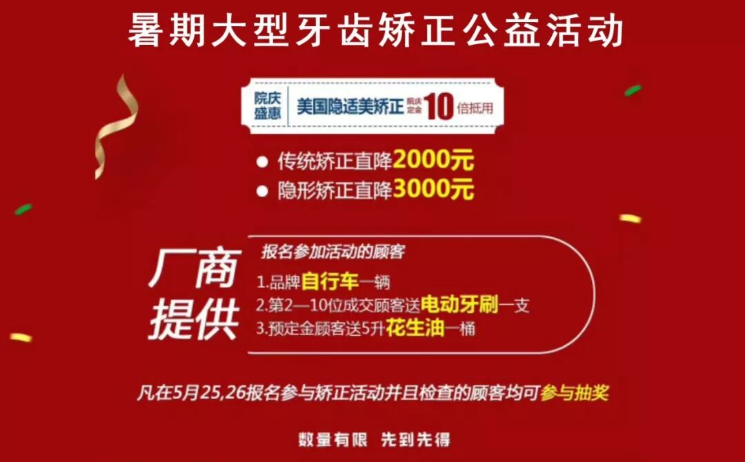 牙齿不齐是一种怎样的体验,不敢开口笑甚至连说话都要遮遮掩掩、吃东西塞牙、面部不协调……正在看这篇文章的你是否对此深有体会。 从口腔健康的角度来说,牙列不齐会使口腔菌斑易于附着、不易清洁,引起牙龈、牙周炎症,出现牙龈肿胀、牙周发炎、出血。更严重的是,牙齿畸形会影响心理健康,妨碍正常的人际交往。 好在,先天的不足很多可以通过后天的“努力”来弥补—牙齿矫正 每年6月-8月都是潍坊矫正牙齿的高峰期,一方面,大、中、小学生集中放假,另一方面,各个口腔机构及国际牙齿矫治器厂家提供的支持力度达到年度高峰值,矫正费用更低。前来就诊矫正的患者不计其数。 为解决暑期矫正就诊难问题,潍坊可恩口腔将于5月提前开启“2019年暑期大型牙齿矫正公益活动”报名参与活动的市民可享受相关政策减免! 牙齿矫正月底送福利啦! 凡在5月25,26报名参与矫正活动并且检查的顾客均可参与抽奖. 1.品牌自行车一辆 2.第2-10位成交顾客送电动牙刷一支 3.预定金顾客送5升花生油一桶 院庆优惠:美国隐适美矫正定金10倍抵用(交1000抵10000) 为确保顾客享受到最优惠的价格,可恩口腔提前与厂家进行沟通,并获得了传统矫正直降2000元,隐形矫正直降3000元的机会,机不可失,失不再来。 活动日期仅限2019年5月25.26两日 现在牙齿矫正已经很普遍 告别歪牙,焕新貌,更自信! 现在预约即可 0元享800元正畸方案设计费 长按二维码 报名申请 地址: 潍坊市奎文区胜利东街4759号(新华书店东临) 点击下方“阅读原文”即可预约就诊