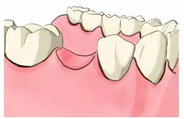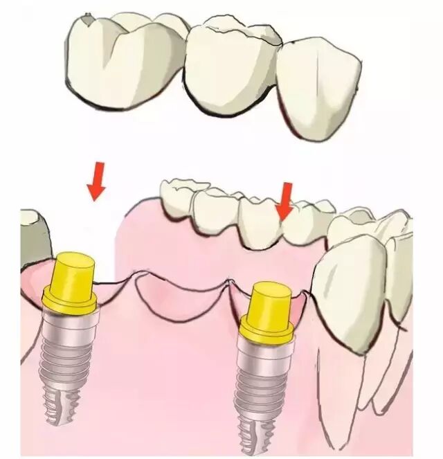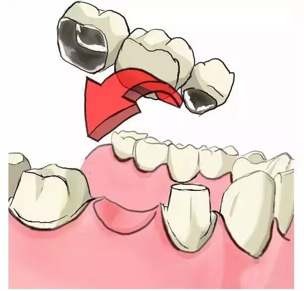在上面套上烤瓷冠,俩边的牙好像桥墩一样,抬起中间的缺牙。