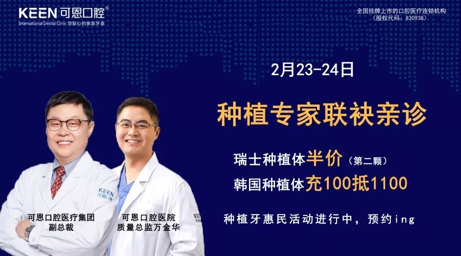 2月23-24日,来,种植牙专家可恩口腔医疗集团副总裁徐连来院长、可恩口腔医疗管理中心质量总监万永康院长 联袂亲诊,解答您关于种植牙的所有疑问!