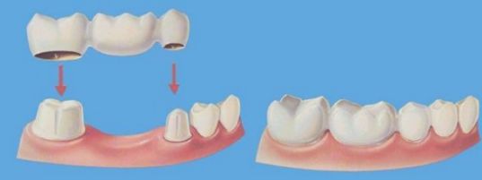固定义齿(烤瓷牙):将缺失牙两边的健康牙磨小,变成“桥墩”,然后用牙套套住两边磨小的牙齿,来架住缺失的牙齿,做成固定桥并用粘接剂粘在两个“桥墩”上。