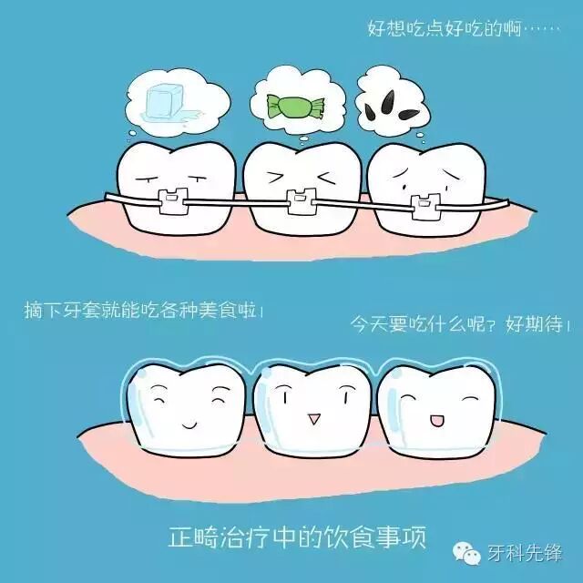 正畸治疗期间,一般饭菜均可食用,但不宜食用粘性食物,大块及较硬的食物尽量切成小片食用,否则容易造成矫治器脱落或损坏。